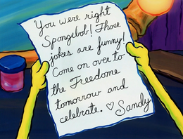 After the performance, SpongeBob finds a note from Sandy, stating that she has finally realized how funny his jokes are and to come to her treedome to celebrate. When he visits her, however, Sandy looks and acts exactly as his jokes make her out to be: an idiotic, clueless yokel.